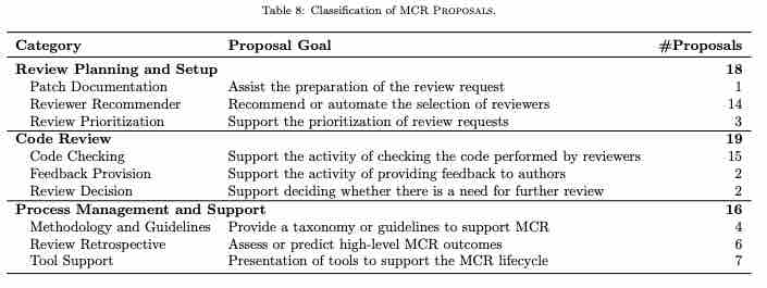 Code Review 从结构化和严格的形式演变为灵活的、基于工具的异步过程,即 Modern Code Review (MCR)。巴西南里奥格兰德州联邦大学 (UFRGS)和阿雷格里港信息学研究所合著的论文《A Systematic Literature Review and Taxonomy of Modern Code Review》 系统分析了 139 篇论文和来自行业、开源项目的问卷,详尽的记录了十多个细节性发现,能帮助我们了全面了解采用 MCR 的动机、挑战和好处,以及哪些影响因素导致哪些结果,并总结了改进 MCR 流程的提案。
