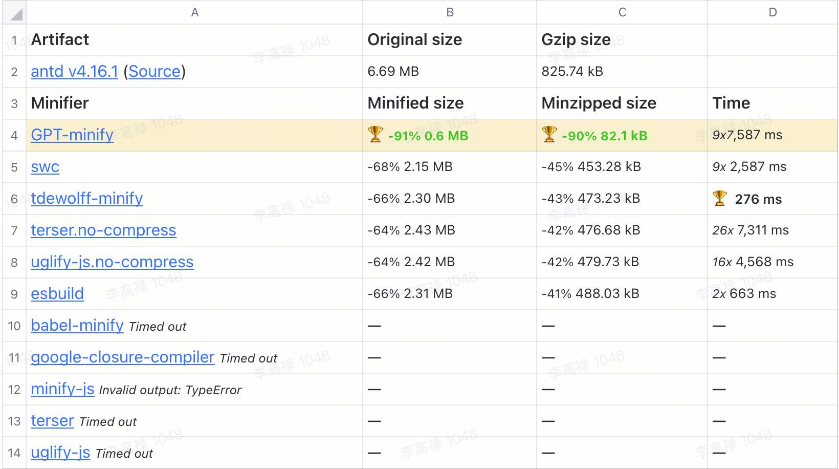 以 AntD 为例子,与开源社区流行的 JS 压缩工具全面对比,GPT-minify 由于机器限制压缩时间长了些,但是压缩比遥遥领先第二名。
